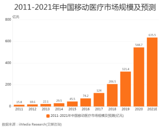 随着国家医疗体制改革进程的推动下,移动医疗产业市场规模快速增长,数据显示,2011-2020年中国移动医疗市场规模不断扩大,其中2011年为15.8亿元,2020年为544.7亿元。预测2021年将达到635.5亿元。